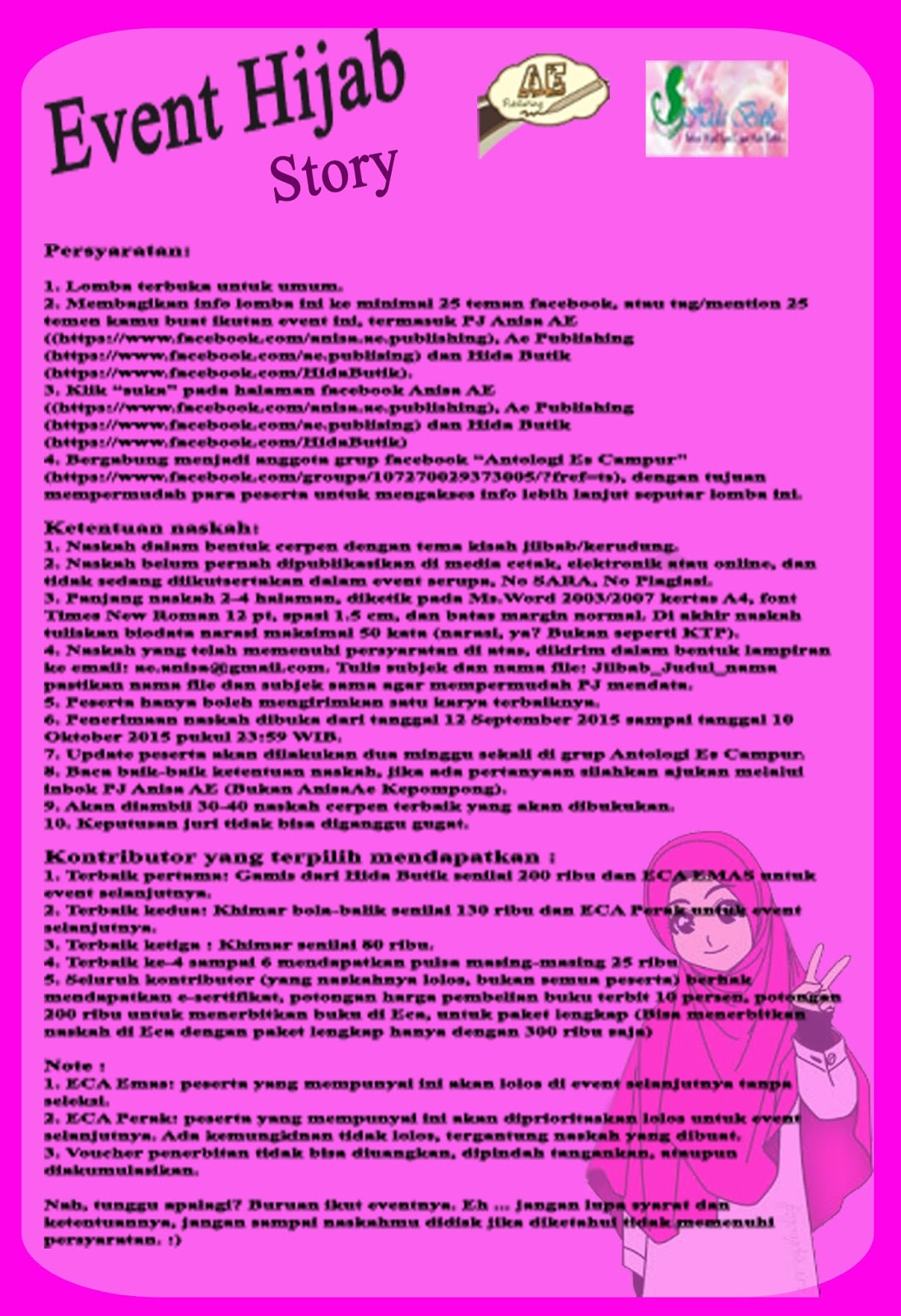 2. Membagikan info lomba ini ke minimal 25 teman facebook, atau tag/mention 25 temen kamu buat ikutan event ini, termasuk PJ Anisa AE (https://www.facebook.com/anisa.ae.publishing), Ae Publishing(https://www.facebook.com/ae.publising) dan Hida Butik (https://www.facebook.com/HidaButik).
